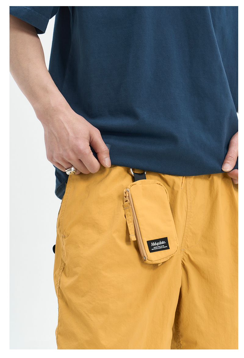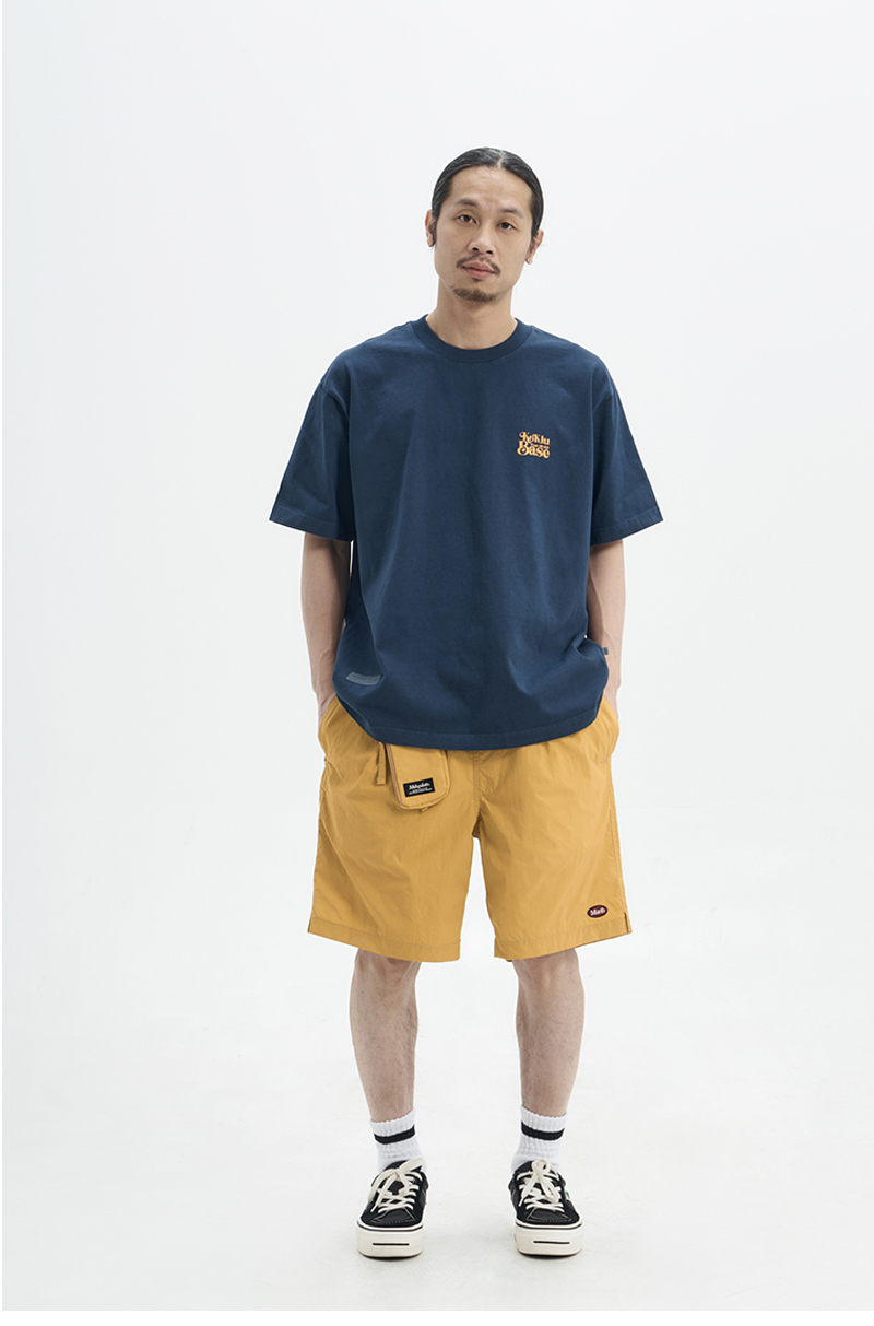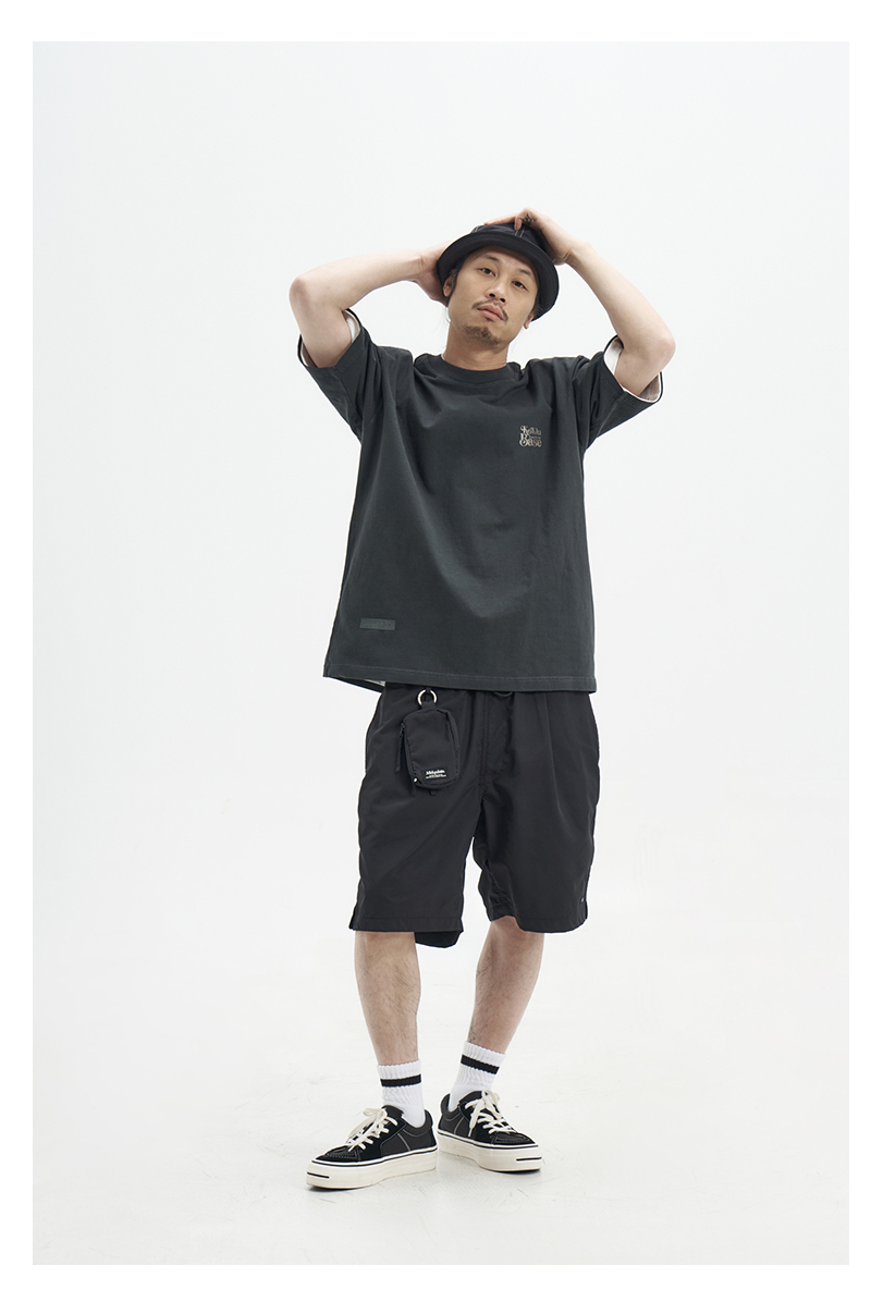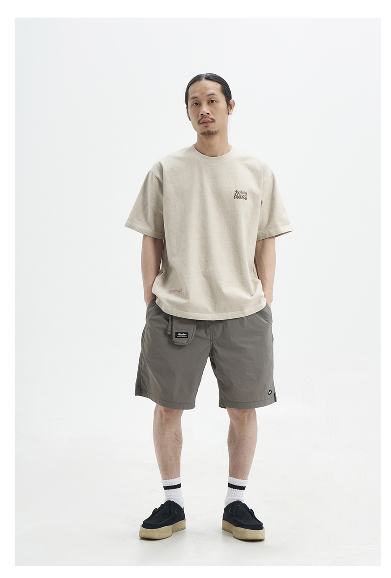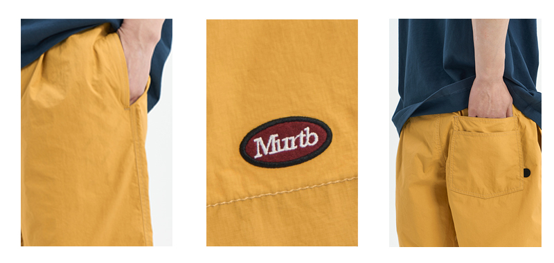 服飾整體落色自然。布料有防潑水功能。腰頭鬆緊設計,腰頭褲腳添加抽繩,讓穿著更容易。另添加小掛包,方便收納。褲腳添加田島機激絨貼布高密平繡刺繡。後幅口袋疊加兩層口袋,增加層次感。