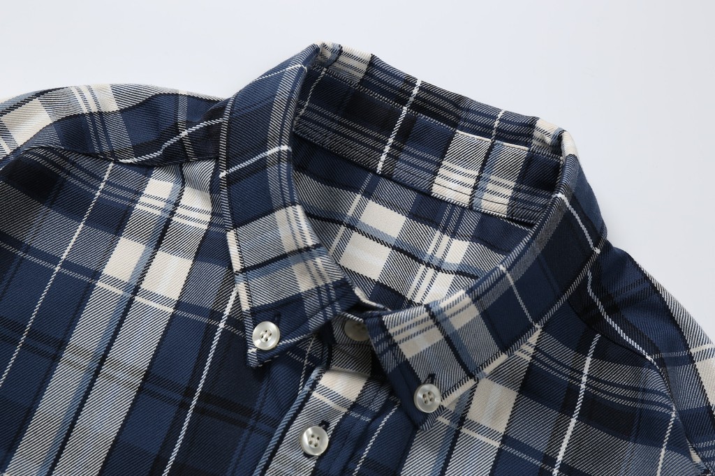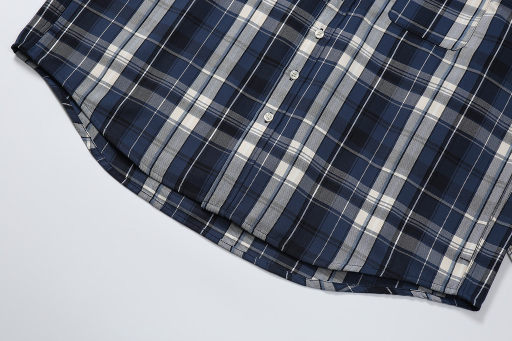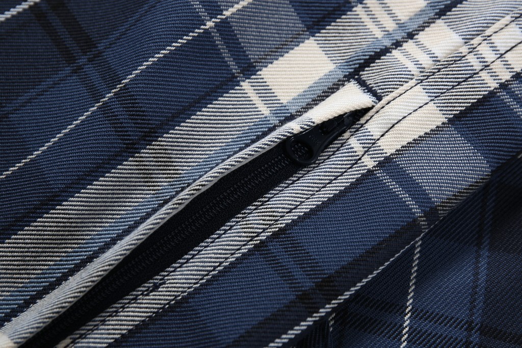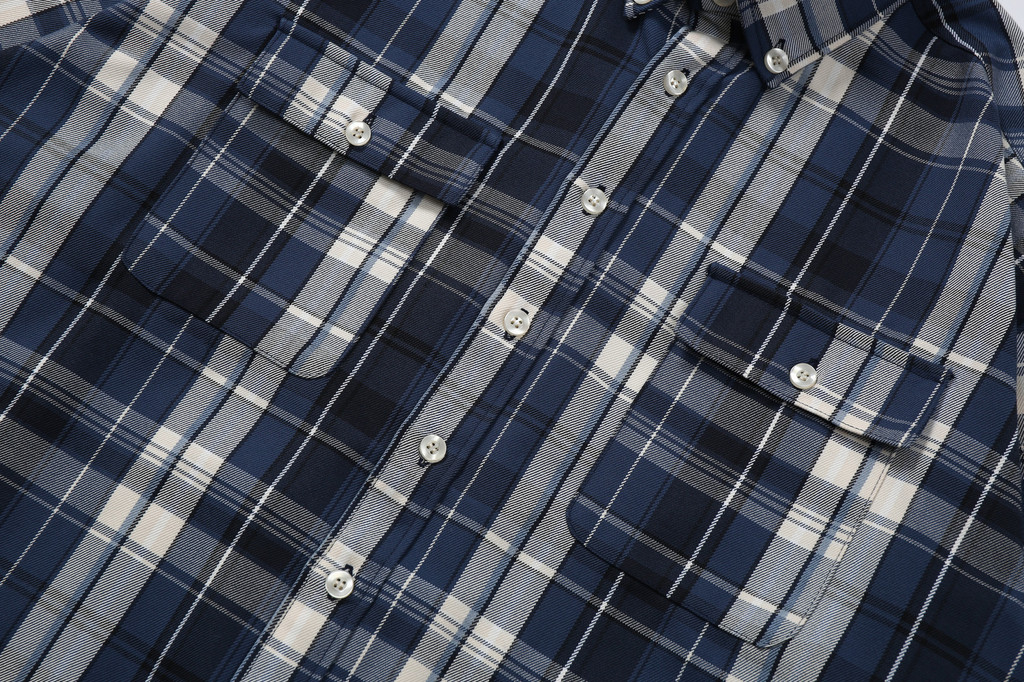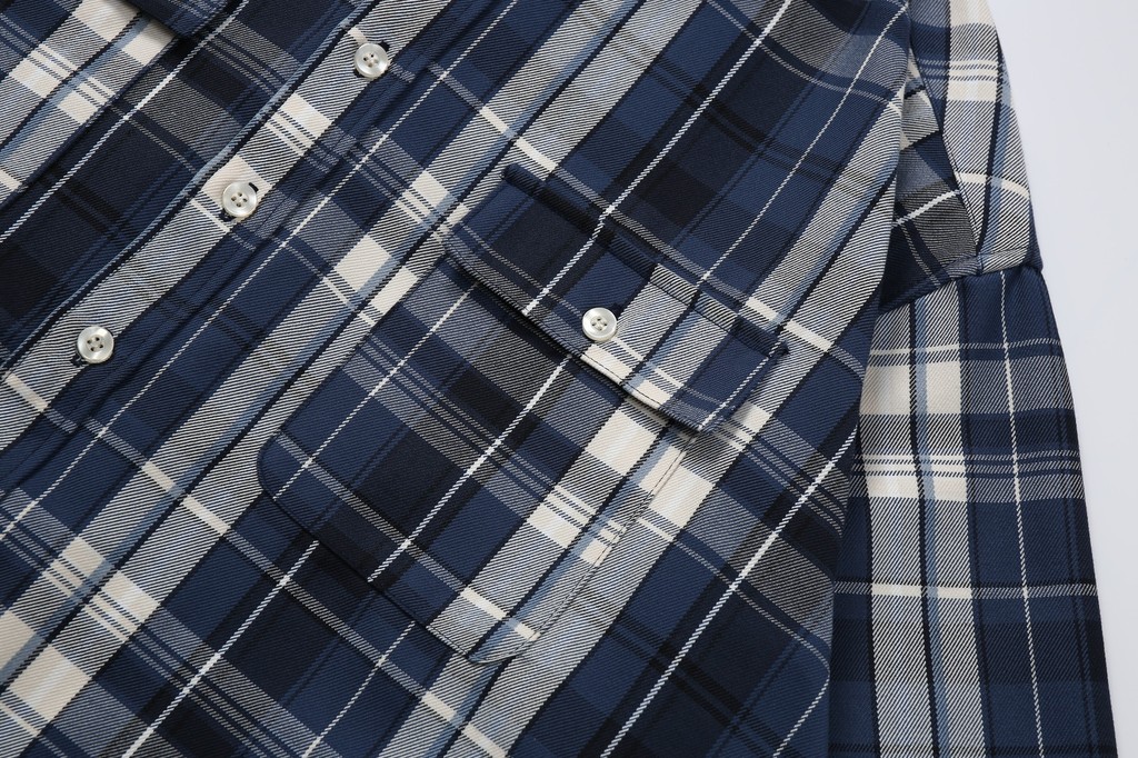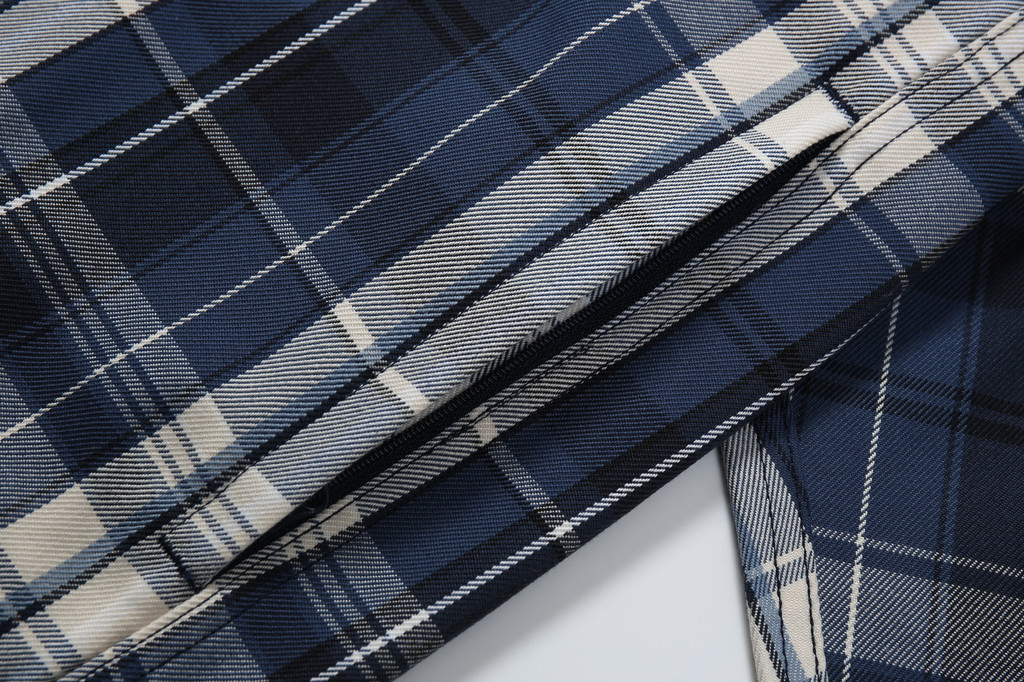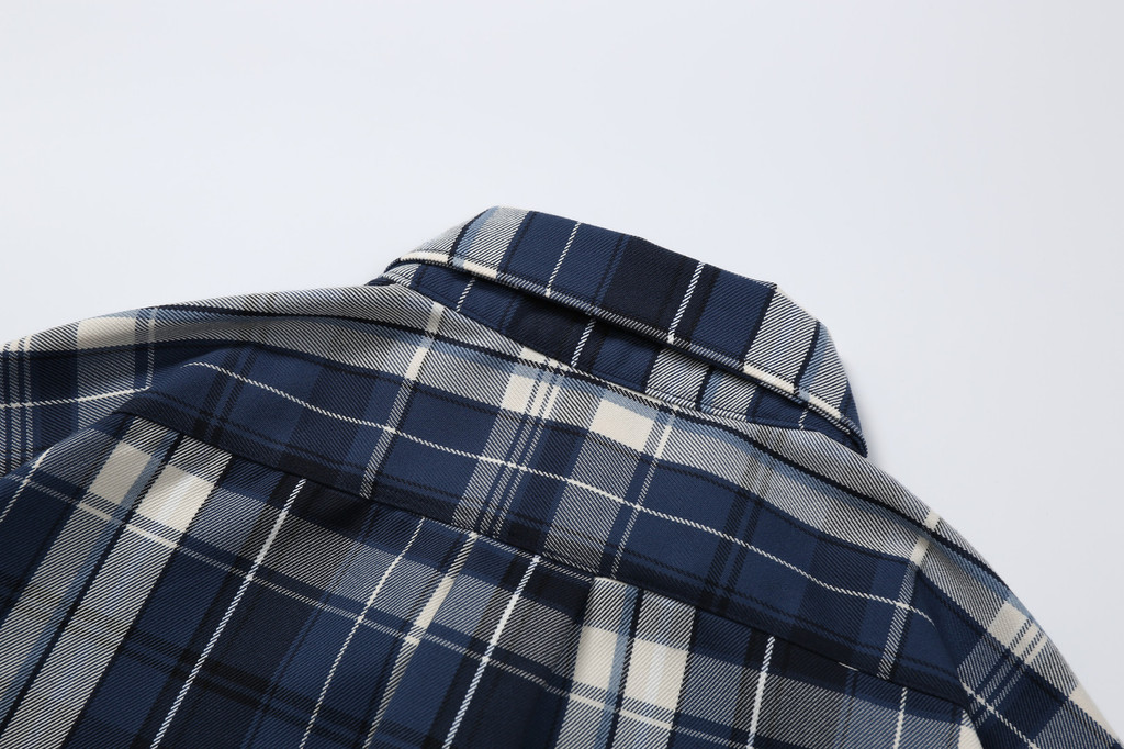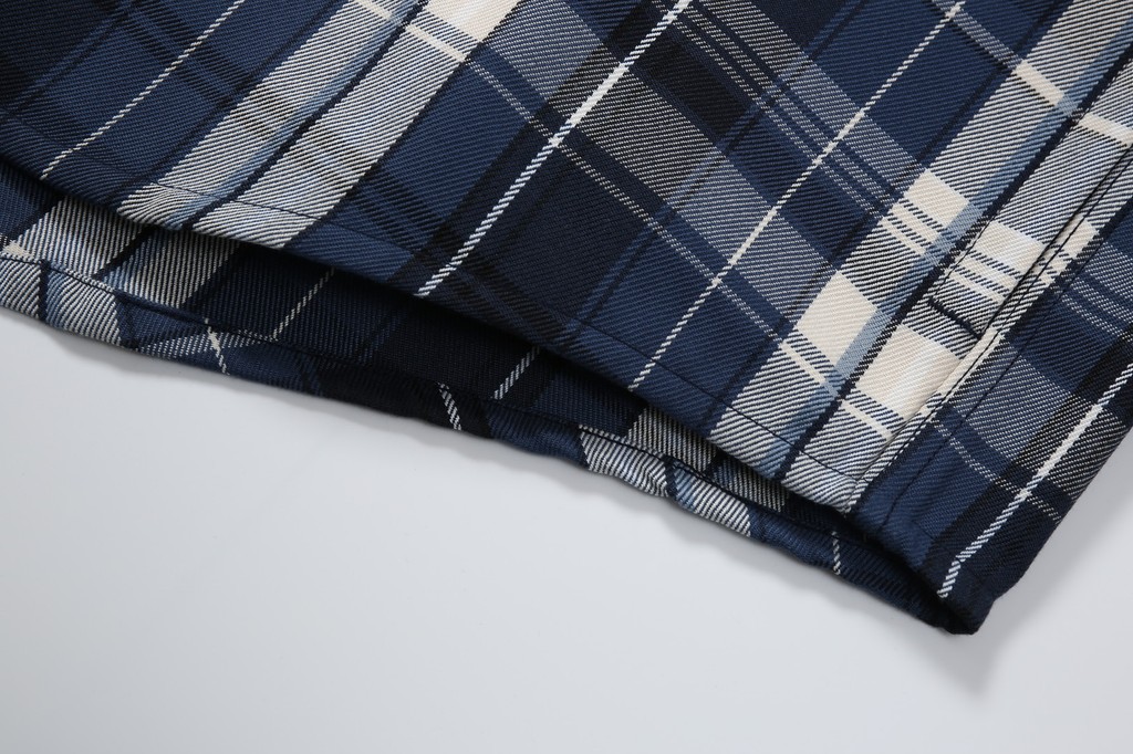 此外,成衣的制作採用了三本針工藝,這是一種高級的縫紉技術,通常只在高品質服裝中見到。它不僅增強了衣物的結構強度,還增添了一種精緻感。細節上,這款襯衫外套在下擺進行了弧度處理,門襟和袖口處則採用了多排鏈條縫紉,這些獨特的設計不僅增加了衣物的時尚感,也讓整體造型更加現代而復古。綜合傳統格紋襯衫的刻板印象,我們的設計將經典與現代風格完美融合,打造出具有豐富視覺層次的時尚單品。