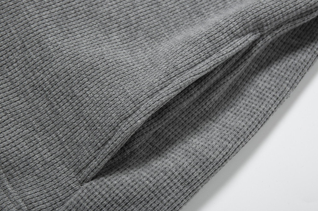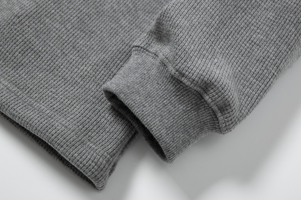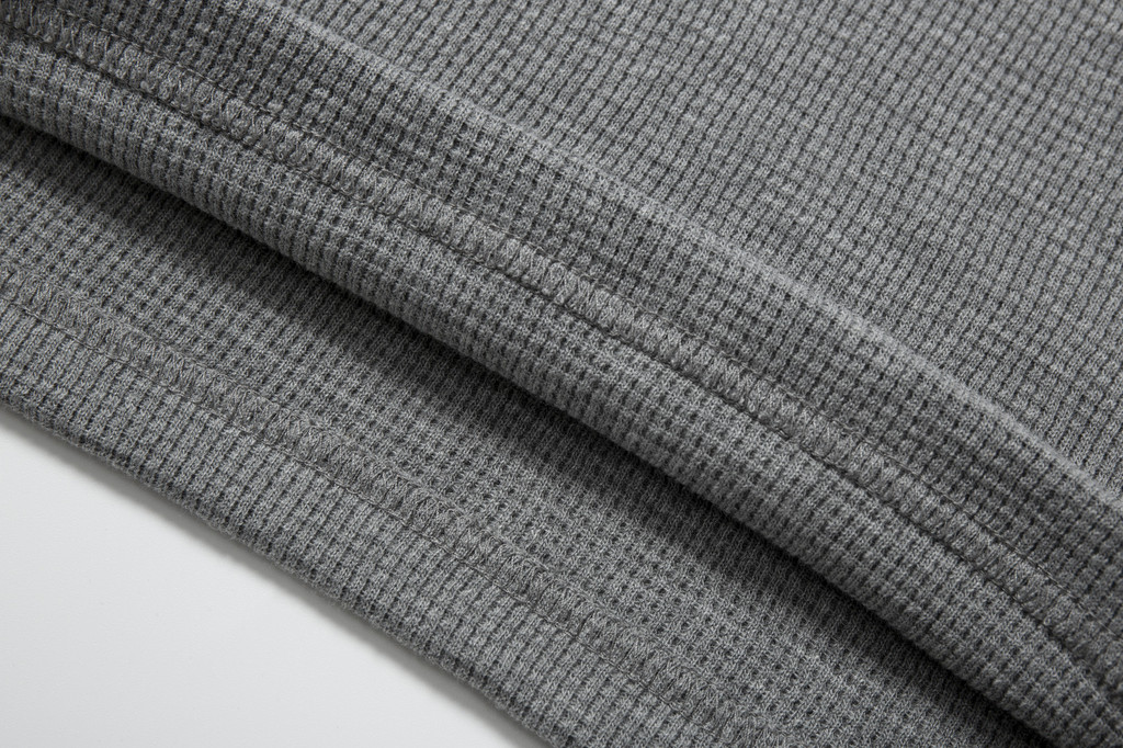 這款重磅華夫格長袖T恤,以精選的全棉紗20S×10S為主要材質,並採用隱格組織的編織方式,使得整體面料在織造過程中更加緊密,紋理清晰且富有立體感。面料在劍杆織布機上經過精確的織造工藝,不僅提升了面料的質感,還使其在經過染整處理後展現出優異的手感和視覺效果。布面細膩光滑,無論是在質地、外觀還是耐用度上,都呈現出優越的品質,屬於高端面料中的佼佼者。