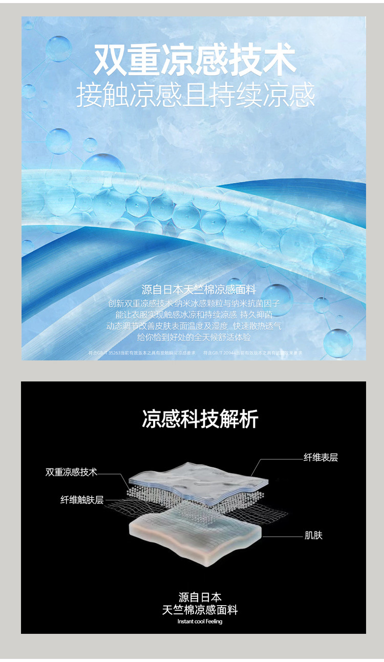 這款T恤採用了日本進口的天竺棉,這種布料不僅觸感舒適,而且引入了創新的涼感技術——黑科技雙重涼感。想像一下,在炎熱的夏天,一件接觸冰冷且持續帶給你涼感的T恤,是不是已經感覺到一陣清爽了?