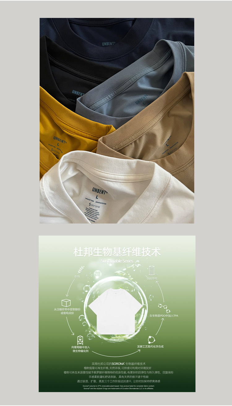 不只如此,這款T恤還採用了杜邦公司的SORONA生物基纖維技術,使用的是從植物提取的可再生纖維SORONA,這種材質不僅環保,還具有出色的回彈性和持久的彈性,保證了衣服的型保效果,穿著不僅舒適,而且隨時保持衣物的挺括和蓬鬆感。