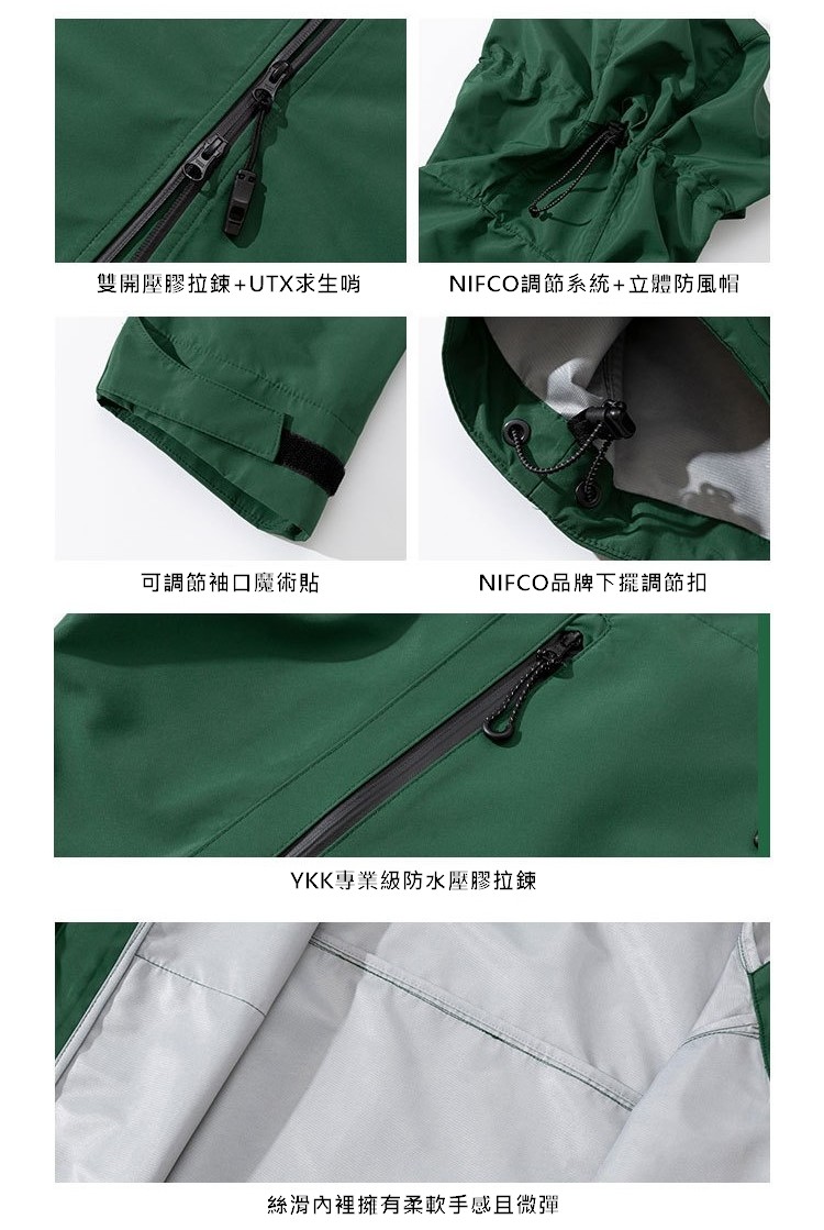 在細節設計上,這款外套同樣匠心獨具。外套搭載了YKK專業級防水壓膠拉鍊,這種拉鍊不僅拉合順暢,還能有效防止雨水從拉鍊縫隙滲入,進一步提升了防水性能。外套的立體防風帽設計,採用NIFCO品牌調節扣,能根據天氣變化靈活調整帽型,提供全方位的防護。袖口則設有可調節魔術貼,可以根據手腕的大小進行調整,避免冷風灌入,同時確保行動時的靈活性。
